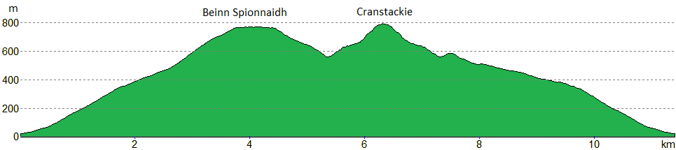 Hillwalking route up Cranstackie and Beinn Spionnaidh from Carbreck following a track to climb grassy slopes to the rocky crests of the twin peaks. Peaks : 2 Corbetts