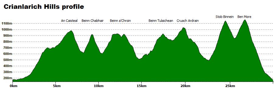 An Caisteal (995m, Munro 147) Beinn Chabhair (933m, Munro 244) Beinn a'Chroin (942m, Munro 231) Beinn Tulaichean (946m, Munro 220) Cruach Ardrain (1046m, Munro 85) Stob Binnein (1165m, Munro 18) Ben More (1174m, Munro 16) |