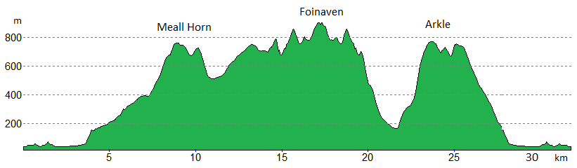 The route starts from near Achfary at the southern end of Loch Stack and initially follows a private road. The road becomes a track as it heads into the Reay Forest wilderness, which higher up if left behind and where terrain is pathless for most of the route over the summits and mountain crests. This is a challenging route where navigation skills and route choice will be tested.